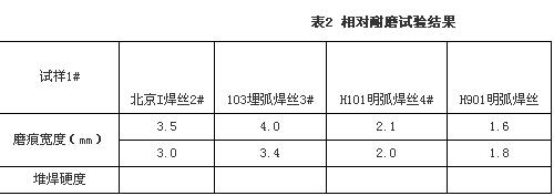 為相對比較各焊絲堆焊層的耐磨性能,請上海材料研究所對表1中四種焊絲的堆焊層按垂直于堆焊層平面作磨損試驗(yàn)。