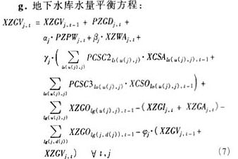 2.3 主要約束方程下面給出水資源配置中,任意一年水資源供需平衡設(shè)計(jì)的主要約束方程。方程中關(guān)鍵符號的含義為:i代表水庫;j代表計(jì)算單元及與單元對應(yīng)的地下水庫;k代表渠道或河流節(jié)點(diǎn);t代表計(jì)算時段;l代表渠道或河流;s代表用水種類,s=1,2,3,4,5依次為城市用水(包括生活用水和工業(yè)用水)、農(nóng)業(yè)用水、河道外生態(tài)環(huán)境用水、河道內(nèi)生態(tài)環(huán)境用水、發(fā)電用水;α為降雨入滲補(bǔ)給系數(shù);β為灌溉入滲補(bǔ)給系數(shù);γ為地表供水河流渠道滲漏補(bǔ)給系數(shù);φ為潛水蒸發(fā)系數(shù);ls(),ld(),lo(),lg()依次為地表水供水河流渠道集合、外調(diào)水供水河流渠道集合、棄水河流渠道集合、地下水聯(lián)系集合,括號內(nèi)有兩個參數(shù),分別為起點(diǎn)和終點(diǎn);u(),d()分別表示上游對象集合和下游對象集合,括號內(nèi)有1個參數(shù),為對象,如水利工程、計(jì)算單元、節(jié)點(diǎn)等。式中沒有被運(yùn)算符號隔開的連續(xù)幾個字母表示同一個變量,變量名第4個字母A,I,E分別表示農(nóng)業(yè)供水、工業(yè)(包括城鎮(zhèn)生活)供水和生態(tài)供水;V為水庫蓄水庫容;C為有關(guān)系數(shù)。