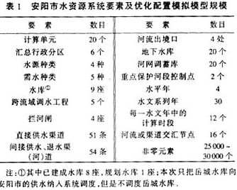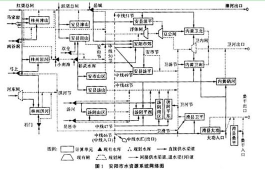 3 模型在安陽市水資源規(guī)劃中的應(yīng)用河南省安陽市水資源系統(tǒng)網(wǎng)絡(luò)圖見圖1,系統(tǒng)要素及配置模型規(guī)模見表1.在安陽市水資源可持續(xù)利用綜合規(guī)劃中,按照水資源三次平衡的思想應(yīng)用本模型對13個系統(tǒng)方案(每方案又包括1998年、2010年、2015年和2030年四個水平年的子方案)進(jìn)行了長系列模擬計(jì)算。一次平衡分別考慮了允許地下水超采和不允許地下水超采兩種情況。一次平衡結(jié)果給出了不采取有效措施的水資源供需平衡動態(tài)趨勢。二次平衡考慮了三種情況:一是保持現(xiàn)狀水平年地下水超采程度,各規(guī)劃水平年都采取了城市污水處理及回用措施,除此之外沒有新建其它供水工程;二是各水平年都不允許超采地下水,都采取了城市污水處理及回用措施,沒有新建其它供水工程;三是各水平年不允許超采地下水,但都采取了城市污水處理及回用措施,新建了當(dāng)?shù)毓┧こ。二次平衡結(jié)果給出了安陽市只依靠當(dāng)?shù)厮Y源和現(xiàn)有外調(diào)水量情況下的水資源供需動態(tài)平衡趨勢及缺水變化趨勢。三次平衡所擬訂的方案都不允許超采地下水,但都配置了跨流域調(diào)水工程。