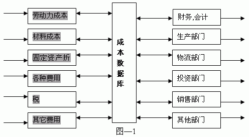 從圖—1中可以看出,成本數(shù)據(jù)庫的構(gòu)建僅限于圖中左邊部分。我們只要羅列企業(yè)各種成本,就可勾勒出成本的輪廓。然而,資金對于企業(yè)的重要性決定了構(gòu)建企業(yè)成本數(shù)據(jù)庫并非簡單的圖表羅列,而是一項復(fù)雜的系統(tǒng)工程。