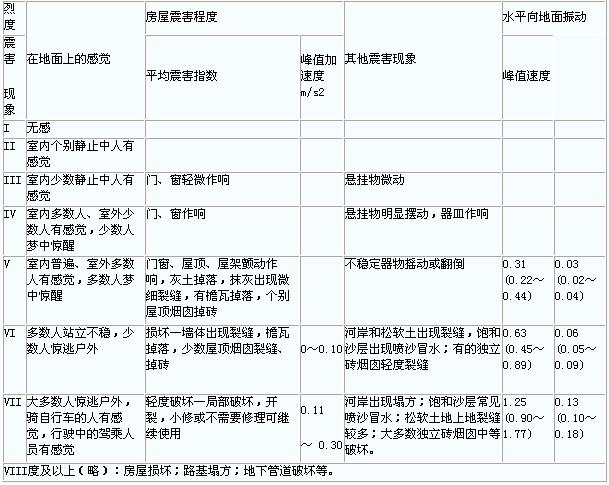 地震烈度是指地震發(fā)生時,在波及范圍內(nèi)一定地點地面振動的激烈程度。地面振動的強弱直接影響到人的感覺的強弱,器物反應(yīng)的程度,房屋的損壞或破壞程度,地面景觀的變化情況等。我國目前采用的是12個烈度等級劃分烈度表,具體見表2.1。