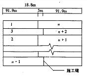 考慮到每條水泥混凝土188.8m長(zhǎng),中間會(huì)產(chǎn)生溫度收縮裂縫,因此在每條水泥混凝土中間附近設(shè)施工縫,縫內(nèi)放傳力桿,相鄰兩條水泥混凝土施工縫交錯(cuò)布置,間距為5m.水泥混凝土用跳格澆筑法,即隔一條水泥混凝土澆筑另一條水泥混凝土,28天后再逐條將空格的水泥混凝土澆筑補(bǔ)齊。