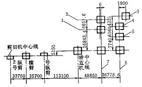 6—三輥軋機(jī)列中心線;7—四輥軋機(jī)列中心線