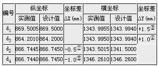 如表1及圖2所示,d1點(diǎn)至d3點(diǎn)的中心線點(diǎn)只需改正ΔY值即可,X坐標(biāo)值可以不予考慮;d2點(diǎn)至d4點(diǎn)的中心線點(diǎn)只需改正ΔX值即可,Y坐標(biāo)值同樣可以不予考慮。此處也可以依圖2所示用d1點(diǎn)至d3點(diǎn)兩點(diǎn)和d2點(diǎn)至d4點(diǎn)兩點(diǎn)分別掛線后予以調(diào)整設(shè)備。