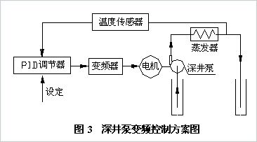 對(duì)于深井泵來說,由于深井水溫度常年保持不變,維持在18.5℃左右,我們以深井水回水溫度為控制參數(shù)即可控制井水的進(jìn)出口溫差。如圖3所示,現(xiàn)采用溫度傳感器、變頻器、PID回路調(diào)節(jié)器組成閉環(huán)控制系統(tǒng),按照5~7℃的溫差指標(biāo),深井水回水溫度控制在T℃(例如冬季12℃,夏季25℃),使深井水泵的轉(zhuǎn)速相應(yīng)于熱負(fù)載的變化而變化。以冬季為例,當(dāng)負(fù)荷增加時(shí),深井水回水溫度降低,溫度傳感器將溫度信號(hào)(4~20mA)反饋至PID回路調(diào)節(jié)器中,PID調(diào)節(jié)器根據(jù)溫度設(shè)定值和溫度反饋值的偏差進(jìn)行PID運(yùn)算,然后輸入給變頻器一個(gè)提高電機(jī)運(yùn)轉(zhuǎn)頻率的信號(hào),加大水泵轉(zhuǎn)速和流量,直到溫度與設(shè)定值一致;反之負(fù)荷降低時(shí),減小頻率,降低水泵轉(zhuǎn)速和流量。當(dāng)水泵運(yùn)行頻率降到控制儀表設(shè)定的低限值時(shí),變頻器停止頻率的繼續(xù)降低,以滿足主機(jī)對(duì)流量的要求,對(duì)主機(jī)起到保護(hù)作用。