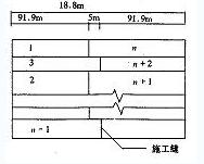 (1)施工縫的合理設(shè)置停機(jī)坪平面形式為矩形(圖1),設(shè)計(jì)圖紙要求停機(jī)坪水泥混凝土沿東西方向分條澆筑,每條寬5m,長(zhǎng)188.8m,條與條之間有瀝青隔離縫。