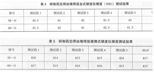 分別采用臺(tái)式硬度儀TH320、便攜式硬度儀HLN-11對(duì)研制藥芯焊絲的堆焊層進(jìn)行了硬度測試,結(jié)果見表4、表5.研制藥芯焊絲堆焊層硬度平均值在61~63HRC之間,與同類產(chǎn)品相比,硬度優(yōu)勢較明顯。