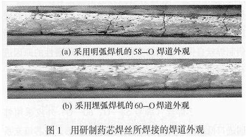 同一種自保護(hù)藥芯焊絲在相同的焊接規(guī)范下由于采用的焊接設(shè)備不同,使得焊接工藝性能差異很大。58-O適合采用ZD7-1000型逆變直流明弧自動(dòng)焊機(jī)焊接;60-O適合采用MZ-1000型埋弧自動(dòng)焊機(jī)不加焊劑焊接,其焊道外觀如圖1所示。