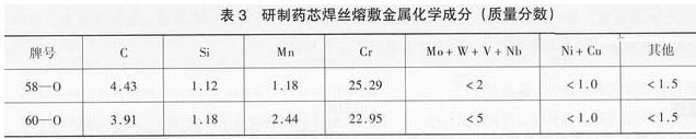 參照GB984制作堆焊試樣,經(jīng)900~1000℃、保溫40~60min、爐冷的軟化處理后鉆取粉末進(jìn)行化學(xué)滴定和紅外吸收分析,測得的研制藥芯焊絲熔敷金屬化學(xué)成分見表3。