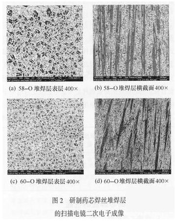 采用Quanta200型掃描電子顯微鏡對(duì)研制藥芯焊絲堆焊層表面和橫截面金相組織進(jìn)行了分析,照片如圖2所示。