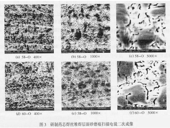 58-O、60-O堆焊層的良好耐磨粒磨損性能正是得益于其優(yōu)化的顯微組織:碳化物數(shù)量多、分布均勻,與馬氏體+少量殘余奧氏體的基體具有良好的強(qiáng)韌性匹配。初生碳化物呈垂直于磨損面的細(xì)桿狀,共晶碳化物呈顆粒狀。