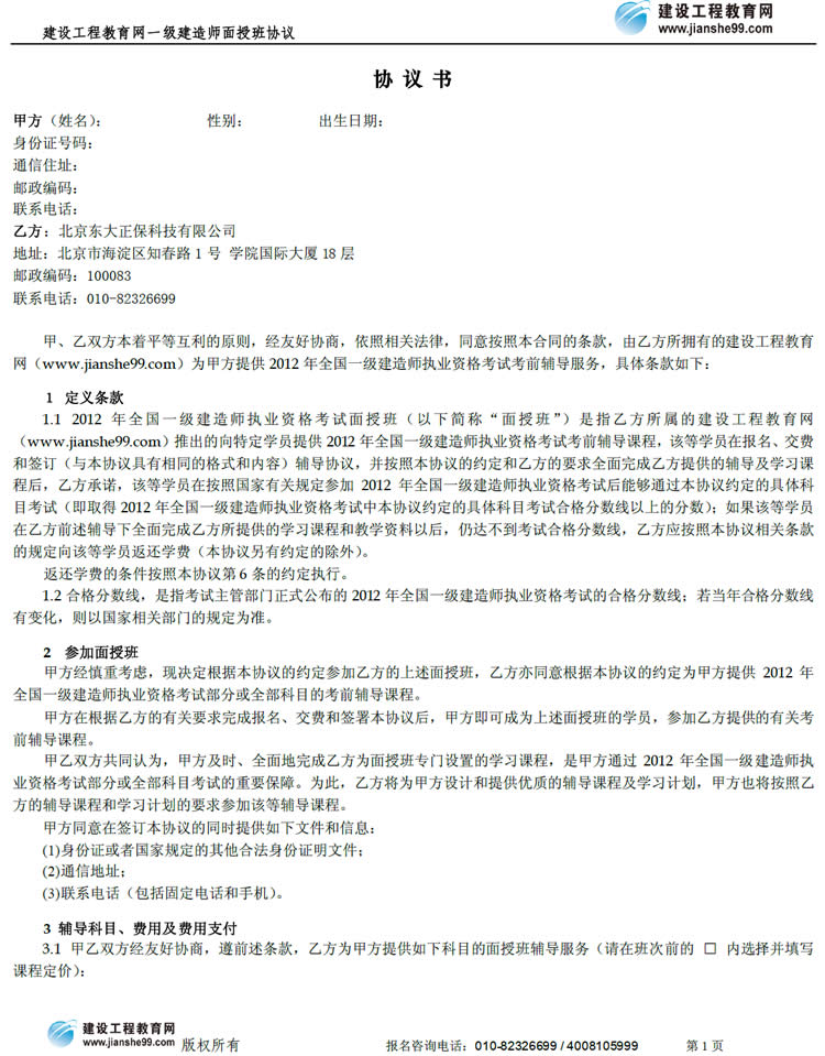 一級建造師“簽約集訓面授班”協(xié)議書