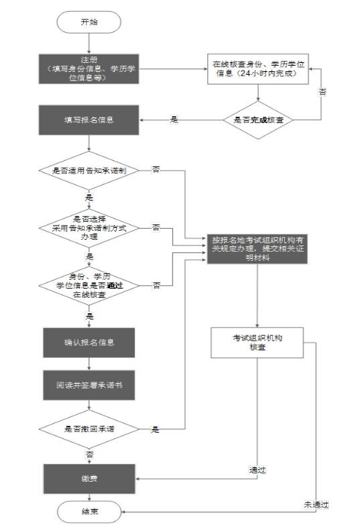 注冊時,身份信息和學歷(學位)信息在線核查結果為“核查通過”且選擇并適用告知承諾制辦理的報考人員,無需進行現(xiàn)場人工核查,系統(tǒng)將自動核查其報名資格,通過后直接繳費完成網(wǎng)上報名工作,屆時打印準考證參加考試即可。