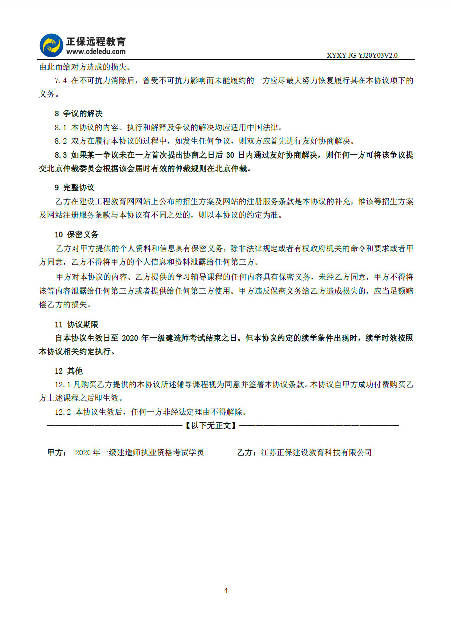 2020年一級建造師無憂定制班續(xù)學(xué)協(xié)議書