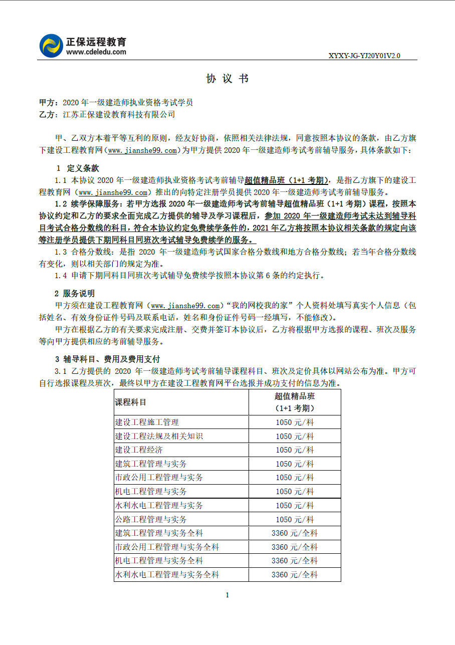 2020年一級(jí)建造師超值精品班續(xù)學(xué)協(xié)議書