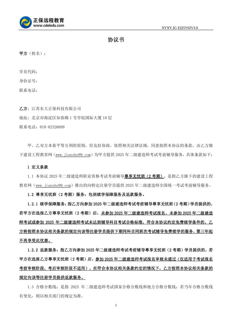 2025年二級建造師尊享無憂班(2考期)協(xié)議書