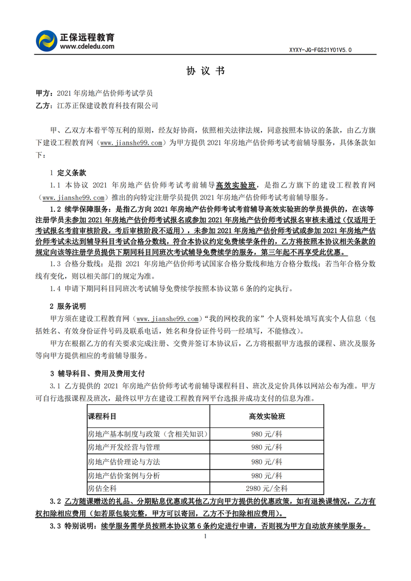 2021年房地產(chǎn)估價師高效實驗班協(xié)議書