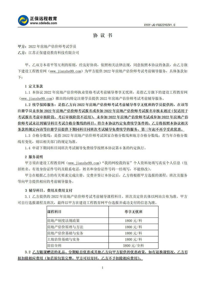 2022年房地產(chǎn)估價(jià)師尊享無憂班協(xié)議書