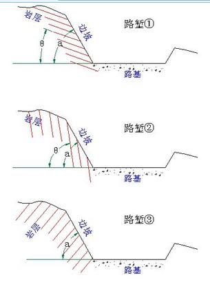 低于原地面的挖方路基稱為路塹?!吧盥穳q”即挖的比較深的“路塹”。高邊坡是指土方開挖高度≥20m的邊坡?!吧盥穳q”當(dāng)然對(duì)“高邊坡”?!斑吰聝A角”指的就是坡面和水平面的夾角。記為α。根據(jù)幾何關(guān)系:tan α=H/L(高度H與寬度之比L)。邊坡傾角α>巖層傾角θ。