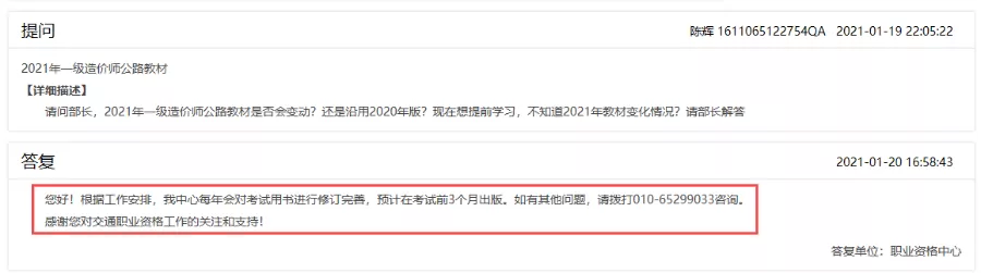 交通運(yùn)輸部回復(fù)學(xué)員問(wèn)題:2021年一造公路教材的出版時(shí)間
