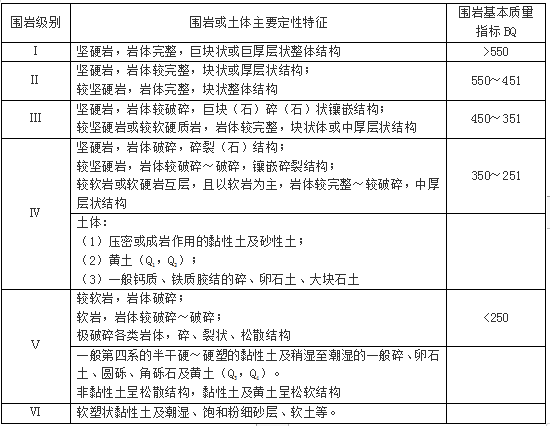 隧道工程按現(xiàn)行隧道設(shè)計(jì)、施工技術(shù)規(guī)范將圍巖分為六級(jí),即Ⅰ~Ⅵ級(jí)。