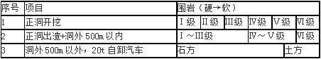 2.隧道工程在對(duì)隧道開挖、出渣時(shí),要根據(jù)不同的圍巖級(jí)別進(jìn)行定額選套。其中洞外出渣要套用路基的定額,具體關(guān)系對(duì)應(yīng)如下: