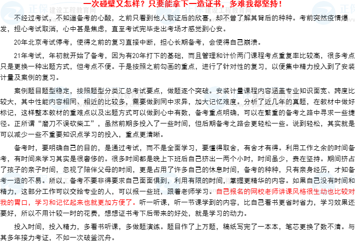 2021年一級造價師考試已經(jīng)結束,建設工程教育網(wǎng)在這個考試結束之際,推出了“我的造價備考之路”有獎征文活動!你投稿我發(fā)獎,在這個考完的放松時刻,讓你說出你的備考心得,分享你的備考醫(yī)路,在此小編為大家整理參與活動的投稿內容,一起分享大家的備考感悟與心得: