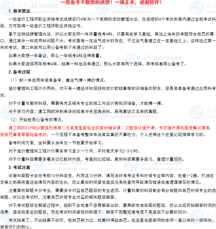2021年一級(jí)造價(jià)師考試已經(jīng)結(jié)束,建設(shè)工程教育網(wǎng)在這個(gè)考試結(jié)束之際,推出了“我的造價(jià)備考之路”有獎(jiǎng)?wù)魑幕顒?dòng)!你投稿我發(fā)獎(jiǎng),在這個(gè)考完的放松時(shí)刻,讓你說出你的備考心得,分享你的備考醫(yī)路,在此小編為大家整理參與活動(dòng)的投稿內(nèi)容,一起分享大家的備考感悟與心得:
