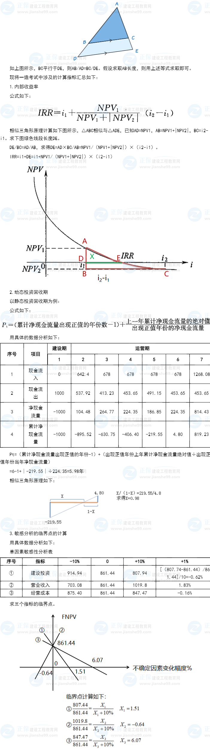 建設(shè)工程教育網(wǎng)2022年一級造價工程師專業(yè)老師為大家整理了一級造價師考試高頻考點(diǎn)“相似三角形原理在一造考試中的應(yīng)用”,在一造的學(xué)習(xí)中,我們會被大量的計算內(nèi)容所困擾,尤其是利用數(shù)學(xué)原理的計算。例如內(nèi)部收益率指標(biāo)的計算、靜態(tài)投資回收期和動態(tài)投資回收期、敏感性分析中臨界點(diǎn)的計算等。遇到這類的問題,對于初學(xué)者來說復(fù)雜的公式會讓我們知其然而不知其所以然。因?yàn)檫@些指標(biāo)的計算公式比較復(fù)雜,且不容易記憶。但是,掌握其中計算原理后,我們可以不死記公式也可以準(zhǔn)確的計算出來。