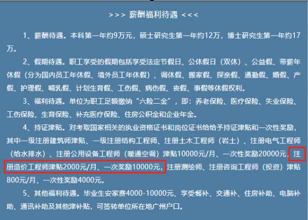 圖中第四條“持證津貼”——擁有各專業(yè)相關(guān)證書的人員不僅有各種對應(yīng)的津貼還有一次性的現(xiàn)金獎(jiǎng)勵(lì),我們看到注冊造價(jià)工程師的持證津貼已經(jīng)高達(dá)2000/月,并且一次性獎(jiǎng)勵(lì)10000元!!!