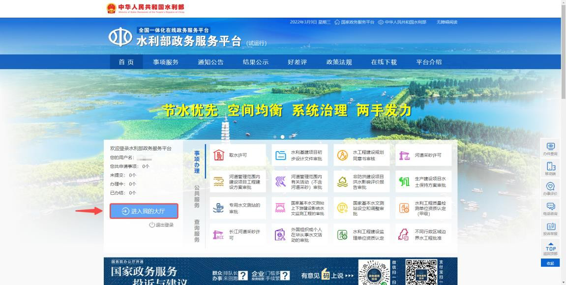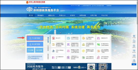 登錄水利部官方網(wǎng)站 ,選擇“服務(wù)”“審批服務(wù)大廳”,進(jìn)入“水利部政務(wù)服務(wù)平臺(tái)”。