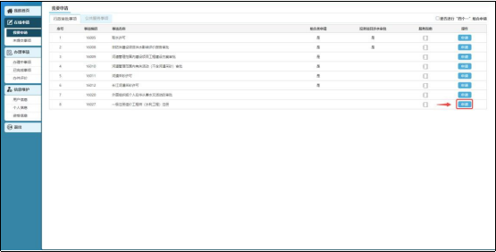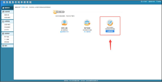 新注冊用戶進入系統(tǒng)申報頁面后,可選擇“立即申請”,進行事項申請,也可點擊系統(tǒng)左側(cè)菜單欄中在線申請的“我要申請”,進入申請頁面后,選擇需要申請的事項類型,點擊申請按鈕。