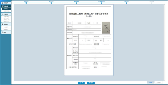 完成填寫申請表后,進入材料清單和附件上傳步驟,用戶可在此上傳承諾書、初始注冊申請表、勞動合同、社保繳費材料、繼續(xù)教育合格證明等材料;可上傳文件格為 pdf,大小不能超過 500M。若有遺漏材料未上傳,系統(tǒng)會提示到具體材料,完成上傳后可進行下一步。