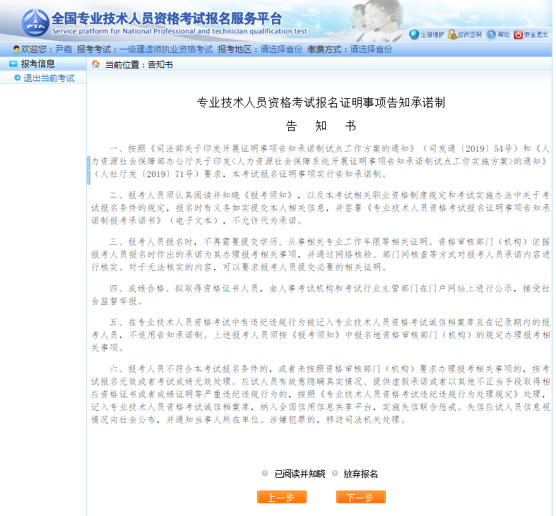 考生們選擇考試類別及考試地區(qū)后,需要仔細(xì)閱讀專業(yè)技術(shù)人員資格考試報(bào)名證明事項(xiàng)告知承諾制告知書: