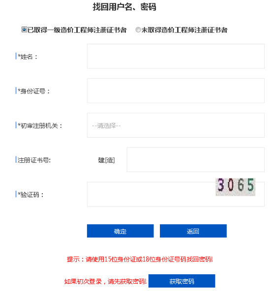在個人登錄頁面,選擇“獲取密碼”,通過身份證號/軍官號/香港測量師互認(rèn)證號(任選其一)、證件號獲取密碼。