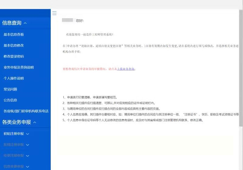 ?。?)人臉識別認(rèn)證成功后,進(jìn)入全國造價工程師管理系統(tǒng) 辦理業(yè)務(wù)。