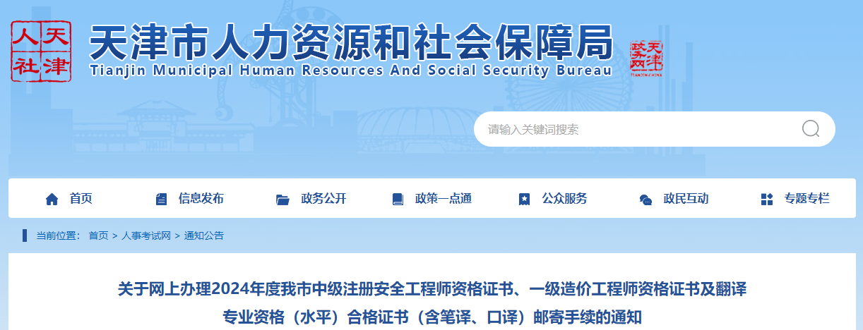 辦理2024年天津市一級造價工程師資格證書郵寄手續(xù)的通知