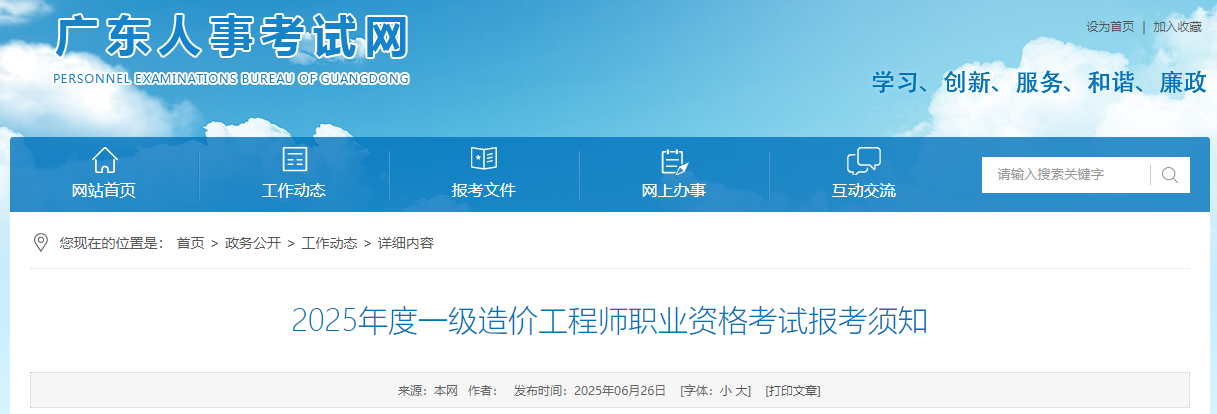根據(jù)人力資源和社會保障部人事考試中心《關(guān)于2025年度一級造價(jià)工程師職業(yè)資格考試考務(wù)工作的通知》(人考中心函〔2025〕22號)和廣東省人力資源和社會保障廳《關(guān)于廣東省人力資源社會保障系統(tǒng)2025年度專業(yè)技術(shù)人員職業(yè)資格考試工作計(jì)劃及有關(guān)事項(xiàng)的通知》(粵人社函〔2025〕26號)要求,為方便廣大考生報(bào)考該項(xiàng)考試,現(xiàn)將有關(guān)事項(xiàng)告知如下。