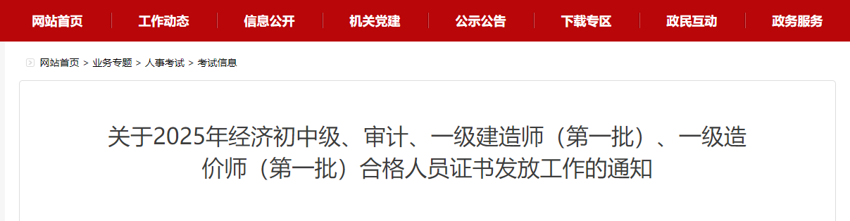 關于2025年經濟初中級、審計、一級建造師(第一批)、一級造價師(第一批)合格人員證書發(fā)放工作的通知
