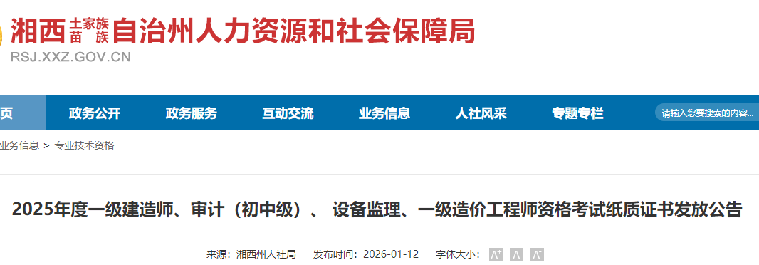 湖南省湘西考點2025年一級造價工程師資格考試紙質(zhì)證書發(fā)放公告