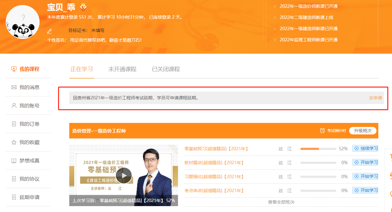 之前已經(jīng)報(bào)名網(wǎng)校2021年一級造價(jià)師考試課程的同學(xué)不用擔(dān)心可以申請延期課程了,入口在“我的網(wǎng)校我的家”,請大家及時(shí)申請,不要錯(cuò)過。