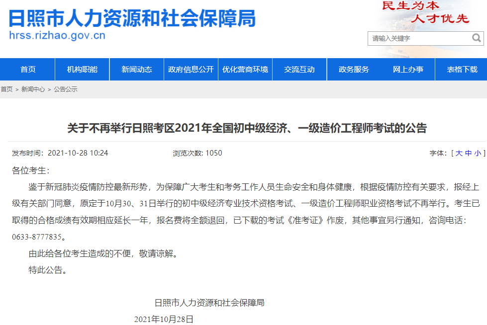 關(guān)于不再舉行日照考區(qū)2021年全國(guó)初中級(jí)經(jīng)濟(jì)、一級(jí)造價(jià)工程師考試的公告
