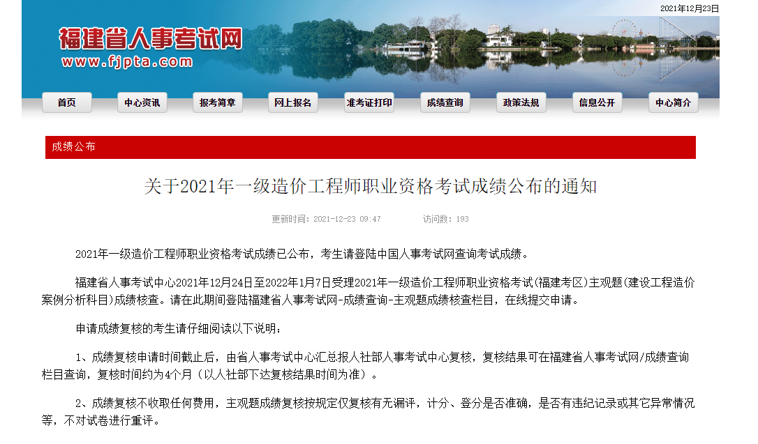 福建省2021年一級造價工程師職業(yè)資格考試成績公布的通知