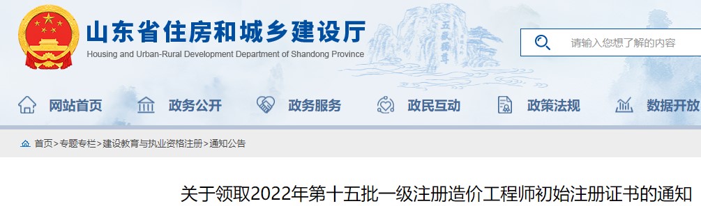 山東?關(guān)于領(lǐng)取2022年第十五批一級注冊造價工程師初始注冊證書的通知