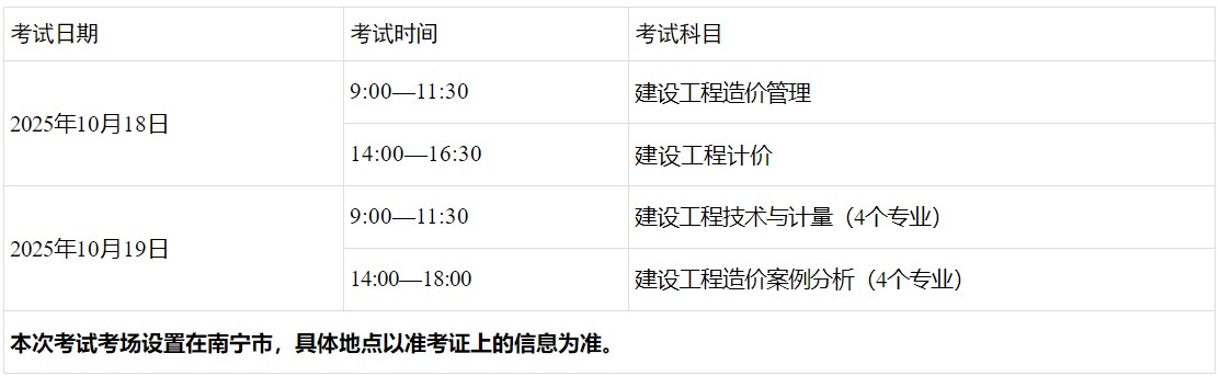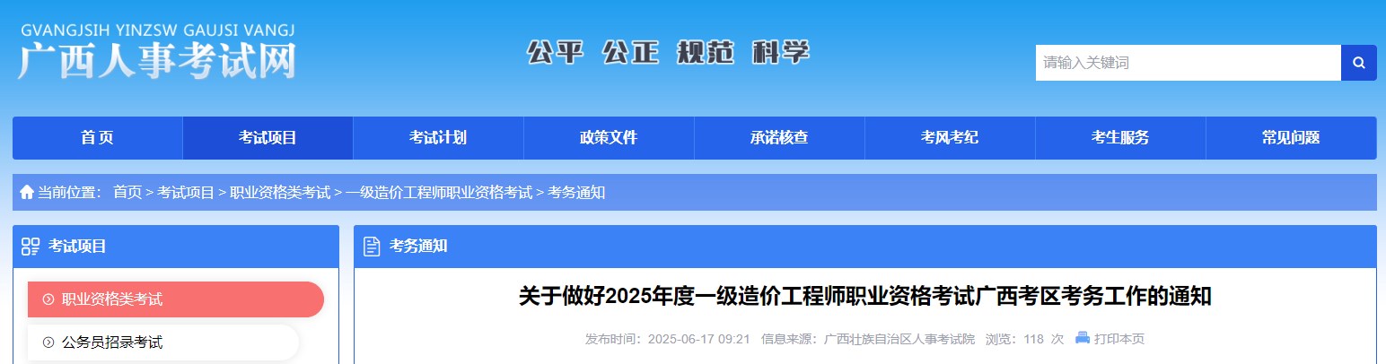 根據(jù)《人力資源和社會保障部人事考試中心關于2025年度一級造價工程師職業(yè)資格考試考務工作的通知》(人考中心函〔2025〕22號)精神,為做好2025年度一級造價工程師職業(yè)資格考試廣西考區(qū)考務工作,現(xiàn)將有關事項通知如下: