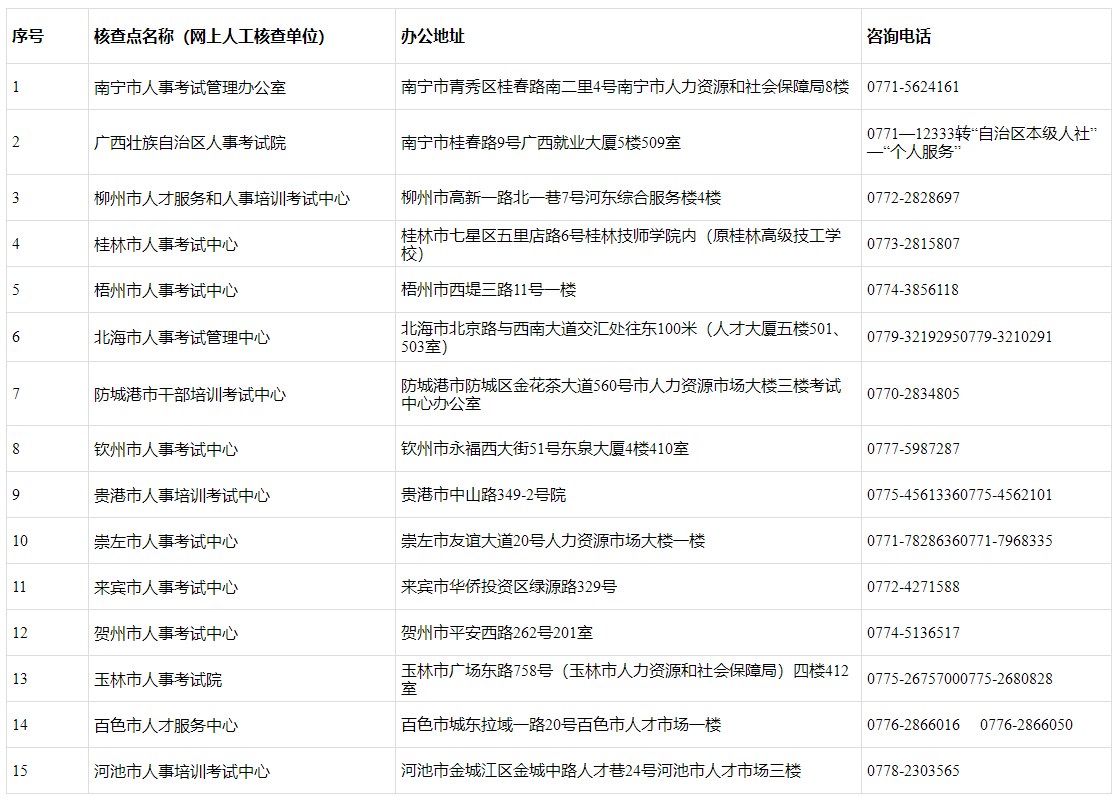 全區(qū)人事考試組織機構(gòu)(核查點)地址及聯(lián)系方式
