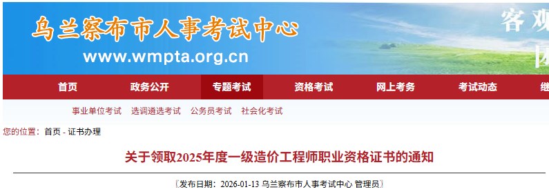 內(nèi)蒙古省烏蘭察布市2025年度一級造價工程師資格證書領(lǐng)取通知