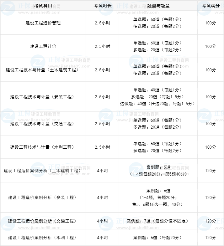 《建設(shè)工程造價(jià)管理》考試時間為2.5小時,《建設(shè)工程計(jì)價(jià)》考試時間為2.5小時,《建設(shè)工程技術(shù)與計(jì)量》考試時間為2.5小時,《建設(shè)工程造價(jià)案例分析》考試時間為4小時。