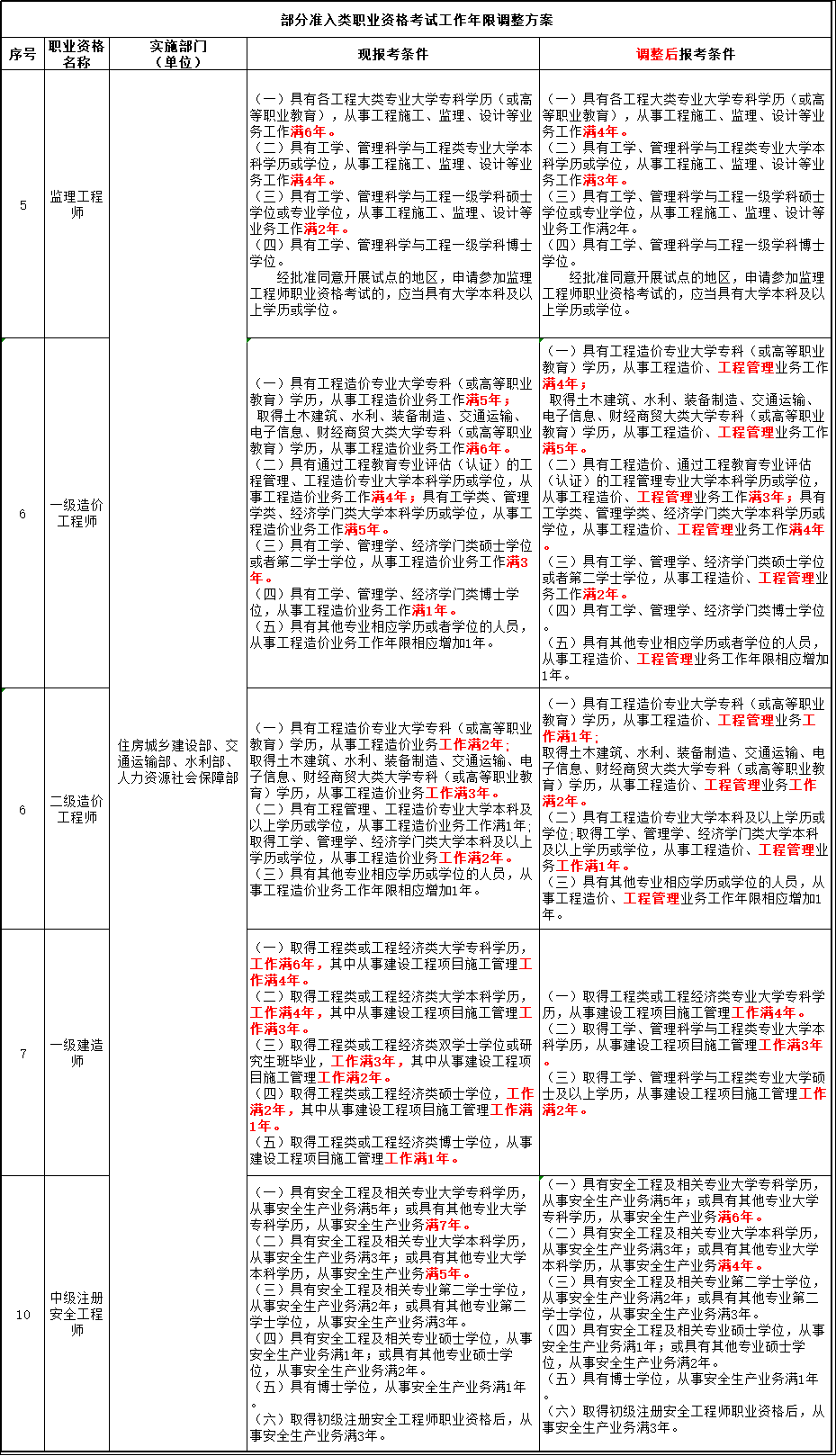 人力資源和社會(huì)保證部于12月3日發(fā)布《關(guān)于部分準(zhǔn)入類職業(yè)資格考試工作年限調(diào)整方案公示》,涉及:一級(jí)造價(jià)工程師、二級(jí)造價(jià)工程師、監(jiān)理工程師、一級(jí)建造師、中級(jí)注冊(cè)安全工程師,工作年限要求降低!放低報(bào)考門檻!是不是說明需要的專業(yè)人才更多?市場(chǎng)需求量大?供不應(yīng)求?原本不符合條件的你,現(xiàn)在可以報(bào)考了?不用再等明年或后年?。?!抓住這次機(jī)會(huì),證書離你更近一步!