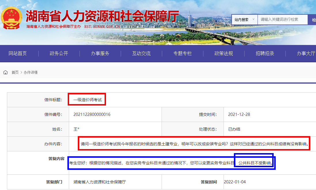 有學(xué)員對一級造價師考試變更專業(yè)科目,其他科目是否受影響問題向湖南人力資源和社會保障廳提問,已得到回復(fù),具體如下:
